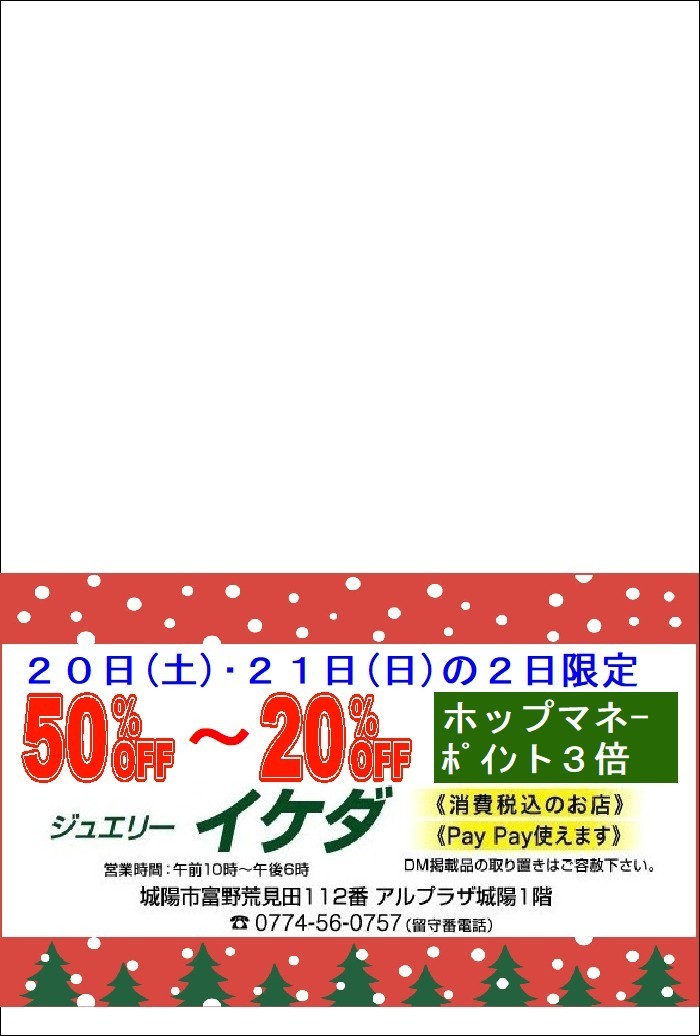 さらに、『在庫入れ替えの為、7割引!!』と『超お買得ダイヤモンド・5万円・10万円・20万円均一セール』を開催いたします。本年最後の大特価セールです。ご来店お待ちしております。