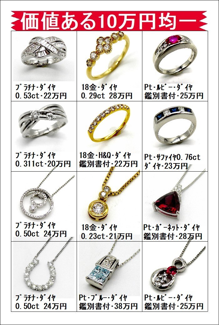 涼しげなプラチナ製品を「3万円均一」「5万円均一」「7万円均一」「10万円均一」と大変お得なプライスのセールです。