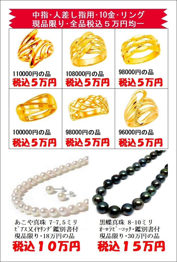 今回は、『1000円のロング・ネックレス』・『5000円均一のピアス』・『3万円・5万円・10万円均一特価』・『7割引の真珠製品』・『1カラットダイヤ特別価格』などお買い得商品満載です。