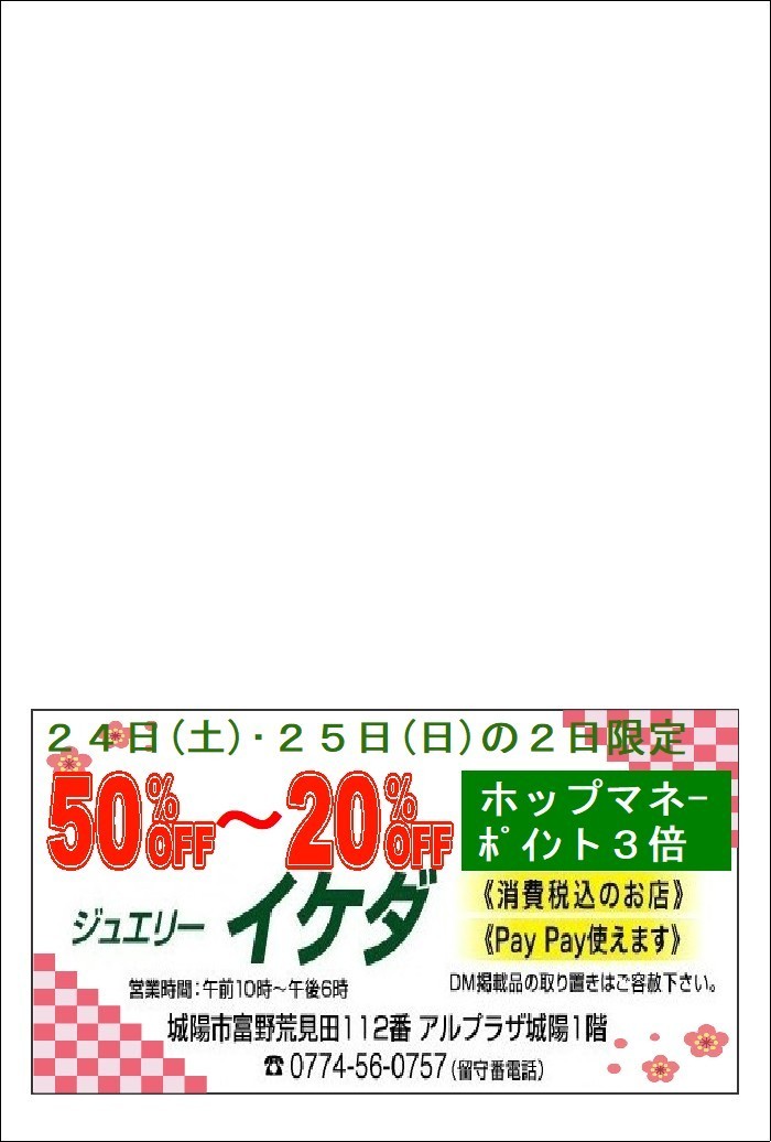 今回は『プラチナと18金のダイヤ・ピアス各18000円の品を限定各5個限り・5000円』『水牛の角のネックレス80%OFFの5,000円均一』『お手頃価格ジュエリーを更に7割引!』など平成最後の大決算セールにふさわしい特別ご奉仕品をご用意いたしました。さらに問屋さんの金庫を大発掘・7割引!お買得ダイヤモンドリングとネックレスを現品限りですが、ご用意しております。ご来店お待ちしております。
