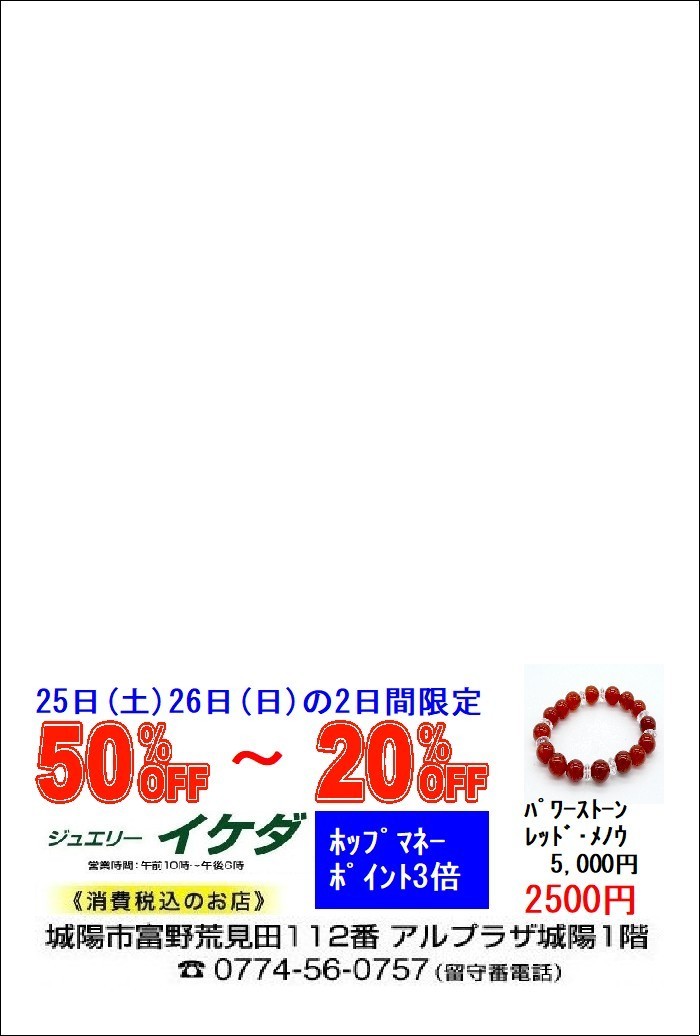 『在庫赤字大処分‼』を1月14日(土)・15日(日)の2日間限定開催+『特招会』を1月14日(火)・15日(水)の2日間限定開催。 『12、000円の天然石ロング・ネックレスを現品限り3,000円均一』『18,000円の天然石ロング・ネックレスを現品限り5,000円均一の』『18,000円~12,000円の現品限りピアスを5,000円均一』『35,000円~22,000円の現品限りピアスを10,000円均一』などすべて現品限りですが、特別価格でご奉仕いたします。更に『3万円均一』『5万円均一』『10万円均一』の現品限りの赤字大処分いたします。皆様のご来店お待ちしております。